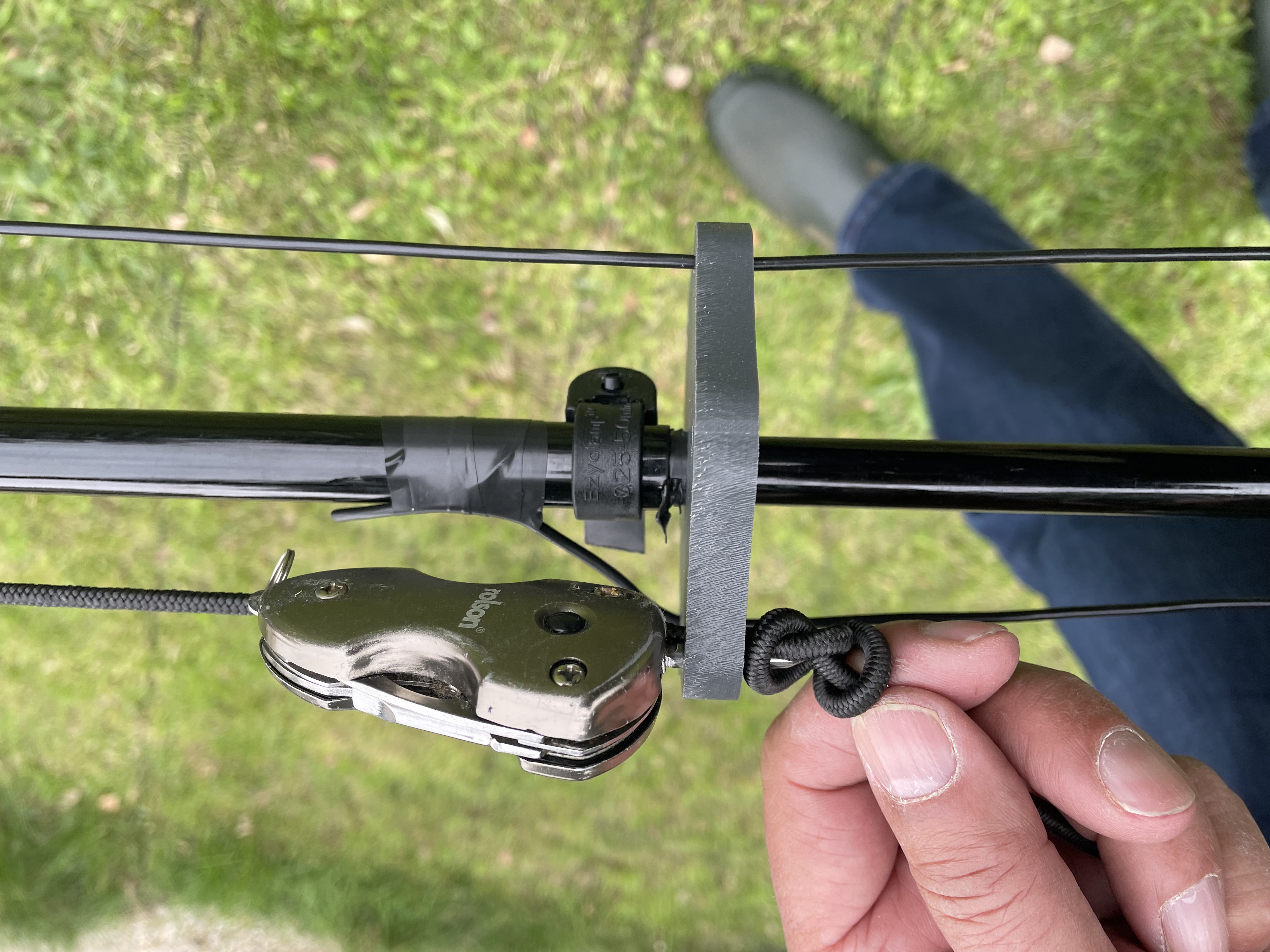 To make the antenna safe in the event of (say) a storm, all Geoff has to do us undo the PL259 and disconnect one spade terminal and he can lift the whole assembly off the pole and lay it down.